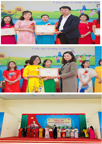 Sau hội thi giáo viên dạy giỏi cấp trường đã có 8 thầy cô giáo được chọn cử tham gia hội thi Giáo viên dạy giỏi cấp Huyện. Hội thi giáo viên giỏi cấp Huyện với sự tham gia của 134 thầy cô giáo đến từ các trường trong toàn huyện lựa chọn dạy 7 môn: Toán, Tiếng Việt, Tiếng Anh, Tin học, Âm nhạc, Mĩ thuật và Giáo dục thể chất, theo Chương trình Giáo dục phổ thông 2018 đối với các khối lớp 1,2,3.Với sự nỗ lực của bản thân giáo viên, sự hỗ trợ, chia sẻ của đồng nghiệp trong toàn trường, cùng tinh thần tự học tập bồi dưỡng chuyên nghiệp vụ. Đặc biệt là sự giúp đỡ, tạo điều kiện của Ban giám hiệu nhà trường cả 8 thầy cô giáo đã hoàn thành xuất sắc các nội dung dự thi và đạt danh hiệu “Giáo viên dạy giỏi cấp Huyện”. Trong đó, cả 8 thầy cô giáo đều đứng trong tốp 5 theo môn học đã đăng kí dự thi. Trong đó, có thầy giáo Nguyễn Văn Phương, cô giáo Phạm Thị Thơm, cô giáo Nguyễn Thị Hồng Vân Anh được xếp loại Xuất sắc trên tổng số 16 giáo viên tiêu biểu trong toàn Huyện.