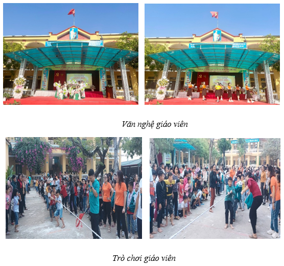 Phần thi kiến thứcCác hoạt động văn hóa, văn nghệ, thể dục thể thao của các thầy cô giáo và các em học sinh cũng diễn ra sôi nổi. Sau những ngày miệt mài trên bục giảng, các thầy cô giáo cùng nhau tập luyện để có những tiết mục văn nghệ đặc sắc chào mừng ngày kỷ nhiệm của ngành. Hoà mình vào những trò chơi vui nhộn cùng bạn bè đồng nghiệp để có những kỷ niệm đáng nhớ.