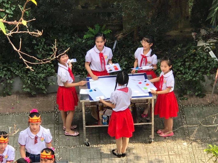 Vậy làm thế nào để chúng ta có thể giảm đi những lo ngại này khi tham gia giao thông? Đã đến lúc mình, các bạn và tất cả mọi người phải làm cho bức tranh giao thông trở nên tươi sáng hơn bằng những việc làm, hành động cụ thể. Ví như hình ảnh một bạn nhỏ đưa cho em mình chiếc mũ bảo hiểm trước khi em cùng với bố tham gia giao thông. Chúng mình đã sử dụng gam màu tươi sáng như vàng, cam, đỏ, lam,… để làm nổi bật hình ảnh này. Điều đó làm cho hành động của bạn nhỏ trở nên đẹp đẽ hơn và mang đầy ý nghĩa. Đây là lời nhắc nhở tới lứa tuổi học sinh chúng mình cũng là lời cảnh tỉnh cho tất cả những người tham gia giao thông.